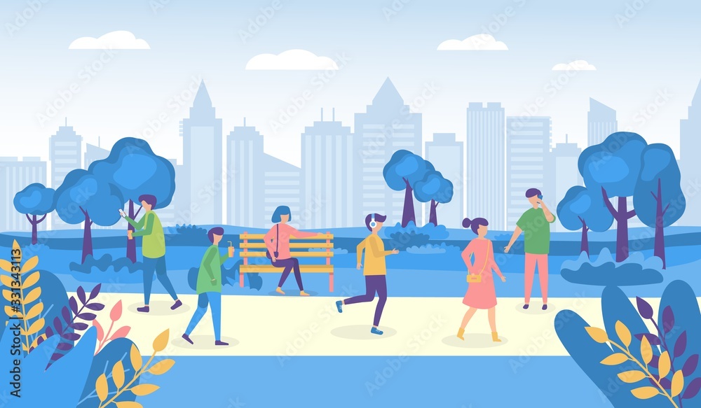 City People Walking Street And Park Vector Illustrations Cartoon Woman Man Characters In Outdoor Park Activity Walk Stand On Sidewalk Relax In Garden Park Together Everyday City Life Summer Stock Vector
